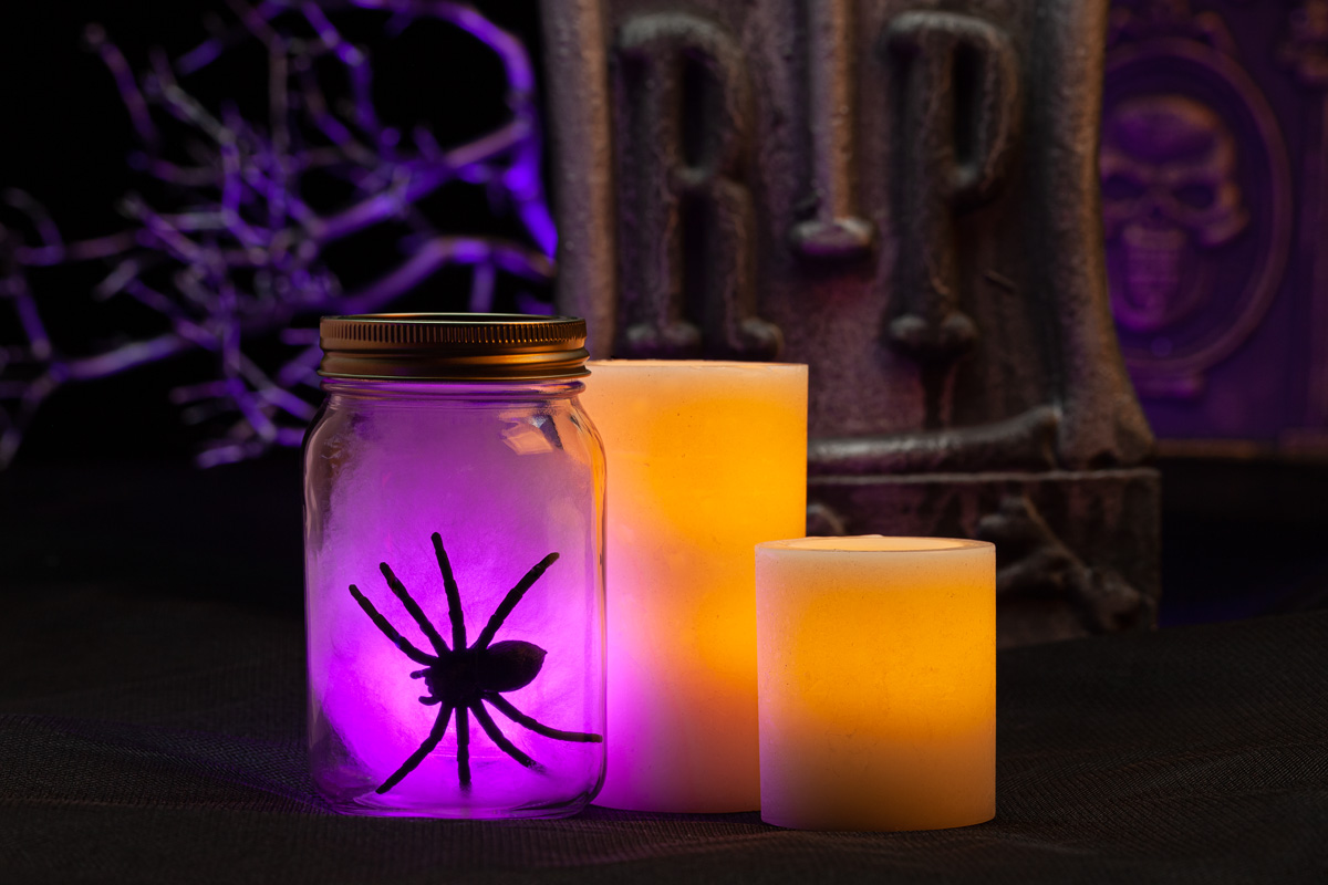 - About this scene: Creating a spooky set that can be placed on a table, mantle or door step. You can easily place around food and drinks to bring your Halloween Party to the next level! Only one G5 Flameless Pillar Candle with a green light.