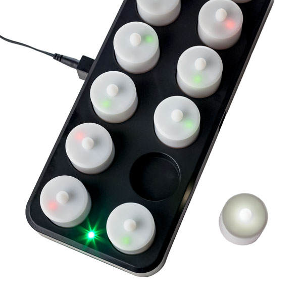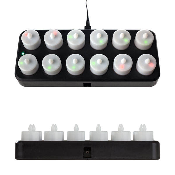 - Charge indicator LED built into the top of each candle. Red is charging, Green is ready!