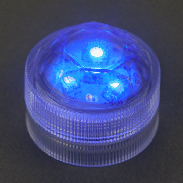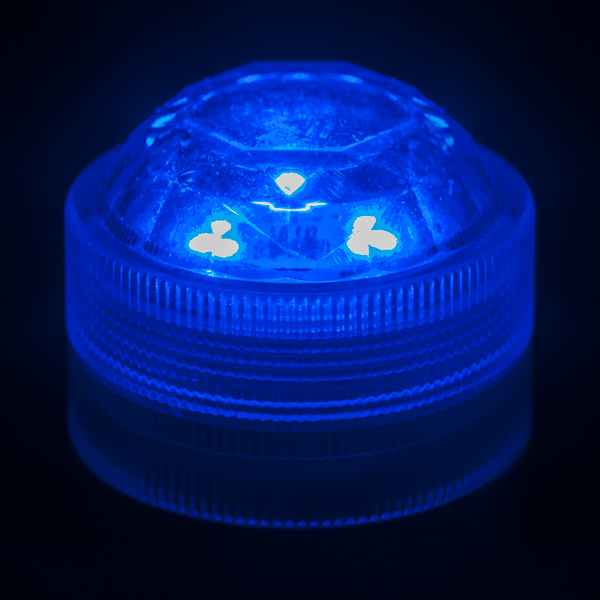 These water proof Triple LED Blue Submersible Lights are available in a variety of great colors. They are about 1.20 Inches in diameter by about 1.1 Inch high, and therefore fit standard Tea Light Holders. That's why they are often called Submersible Tea Lights or Waterproof Tea Lights.