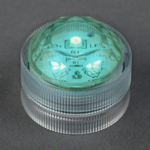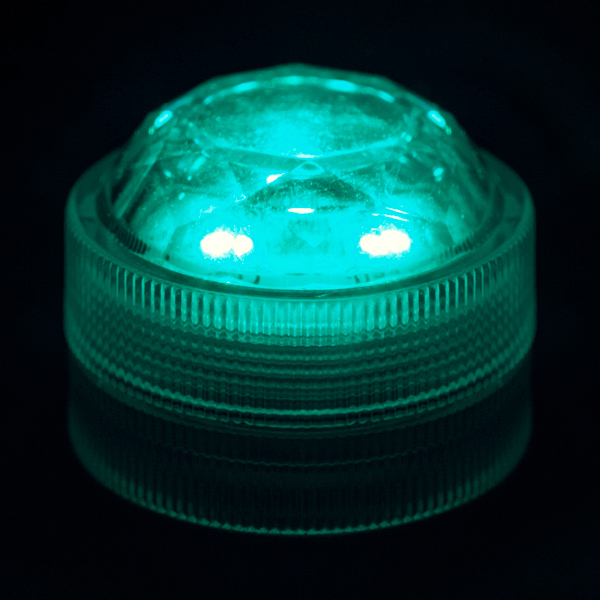 These water proof Triple LED Teal Submersible Lights are available in a variety of great colors. They are about 1.20 Inches in diameter by about 1.1 Inch high, and therefore fit standard Tea Light Holders. That's why they are often called Submersible Tea Lights or Waterproof Tea Lights.