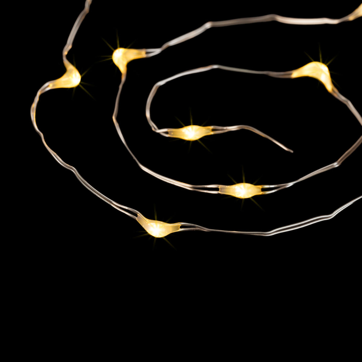 This battery operated waterproof string light utilizes 10 Amber micro LED lights on a flexible moldable silver vine that can hold it's shape. The LED lights are the size of dew drops. You can push these into wine bottles, bear bottles or similar bottles in or out of liquid.