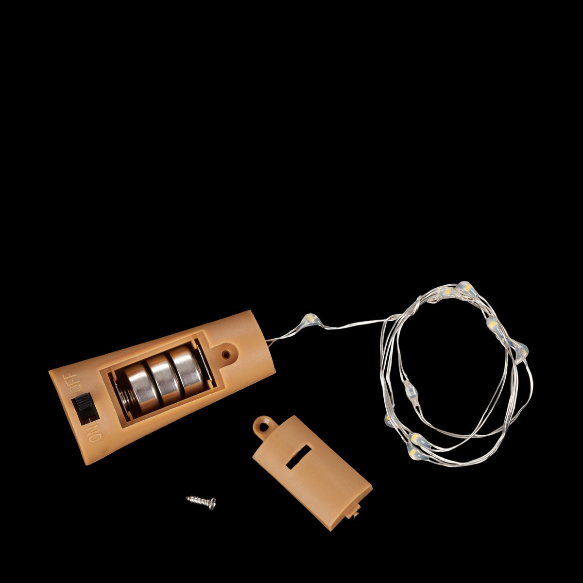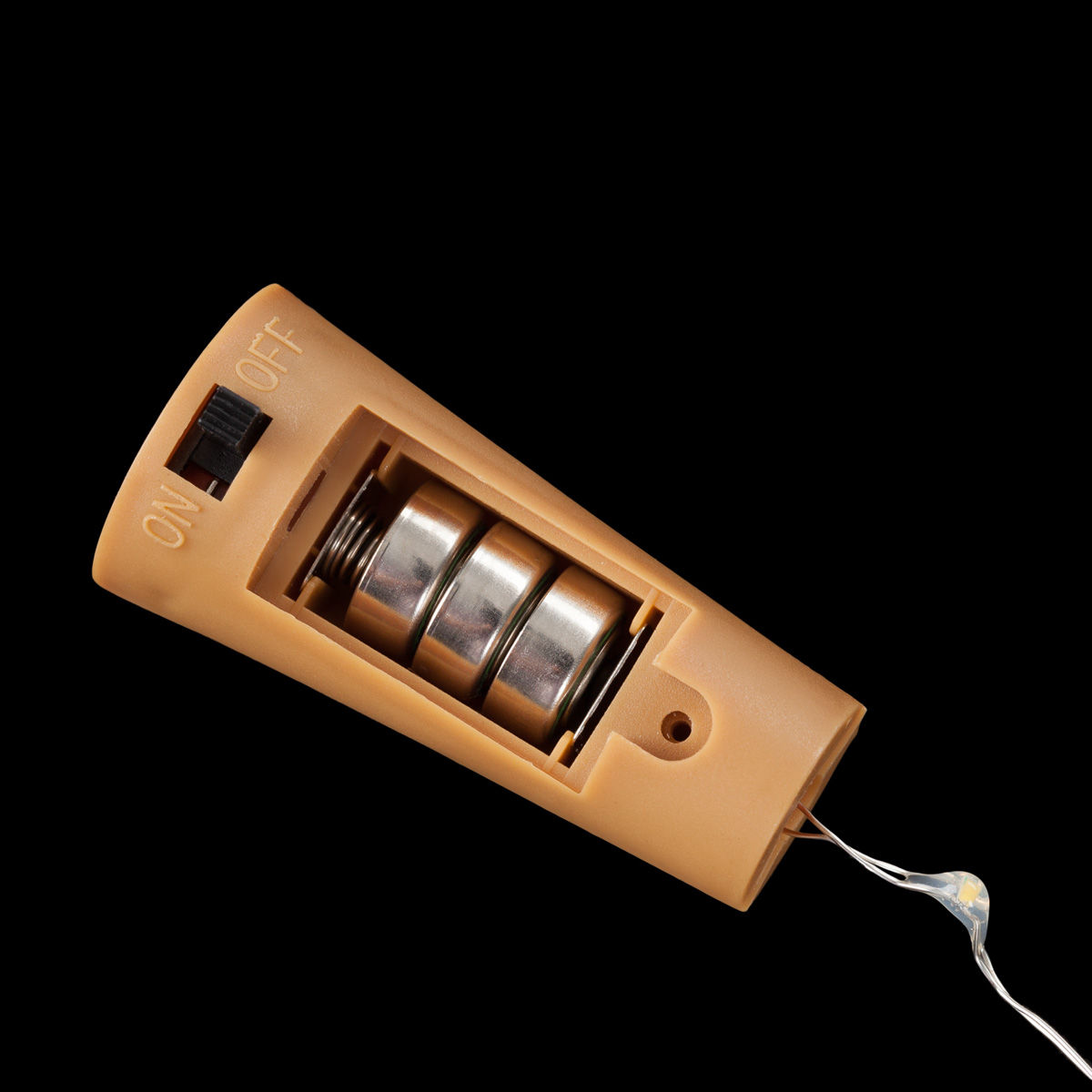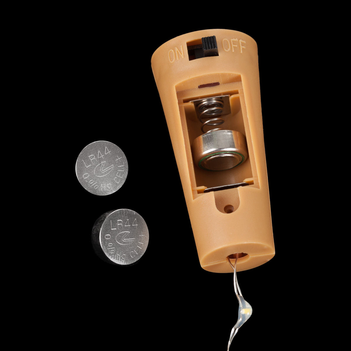 We shrunk down the battery compartment to make it easier to hide. This fairy light string light is ready to use out of the box and can be easily turned On/Off by the switch that is on the top of the battery compartment. It uses 3x LR44 batteries (aka AG13) which are included and are already installed. The batteries are replaceable. Click the following link if you need extra Replaceable Batteries for LED Cork Lights.